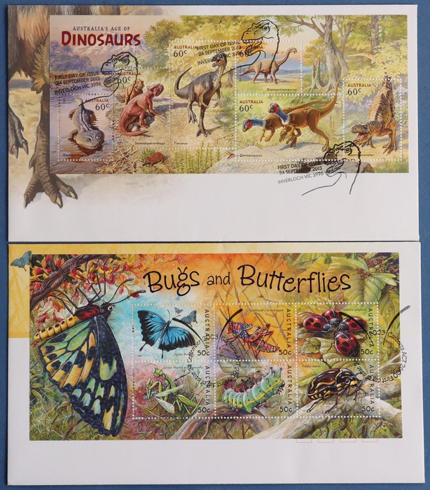 FDC/Commem cancel collection (2000) now in 3 cartons with pre-decimals (50). 1951-65 decimals (1950) to 2013 Dinosaurs M/Sheet inc 1968 Soil/Medical gutter pr on PO envelope, 1970s/80s WCS Commem envs to 1983 Christmas set. Plus wide range of
