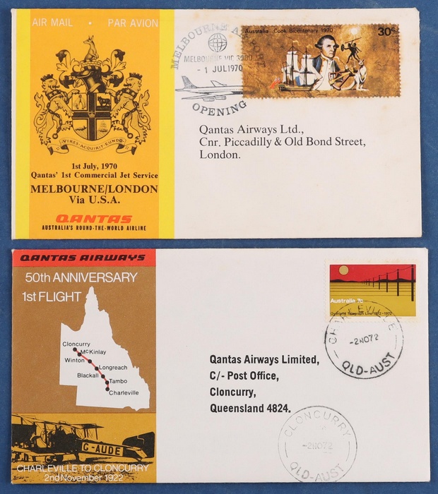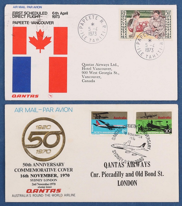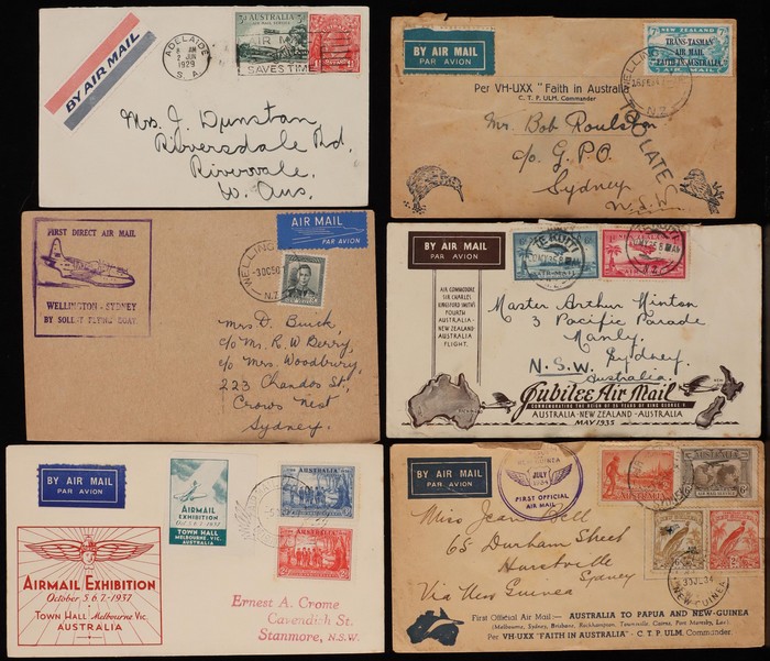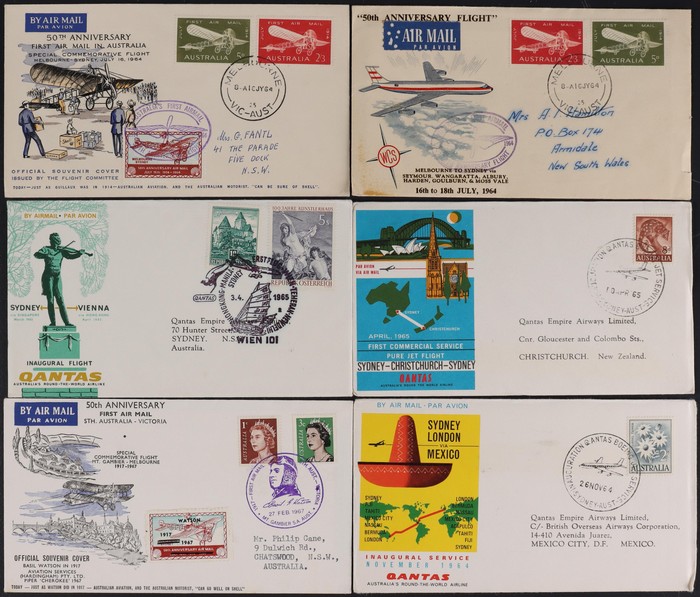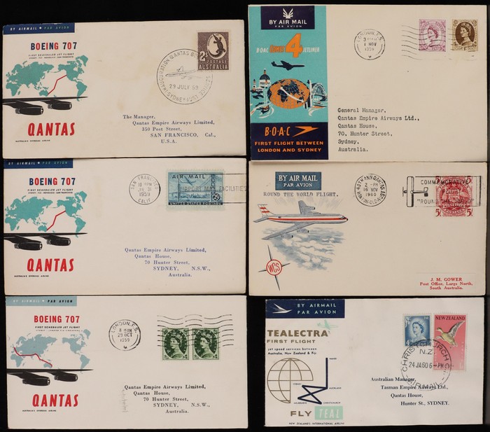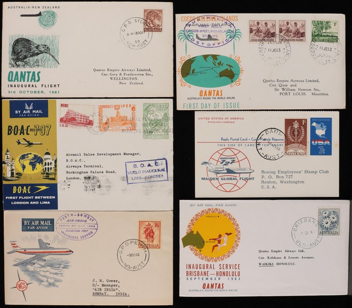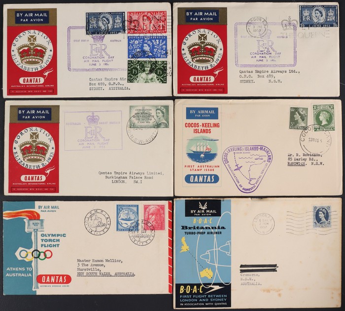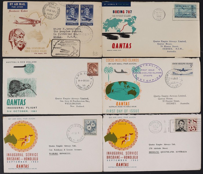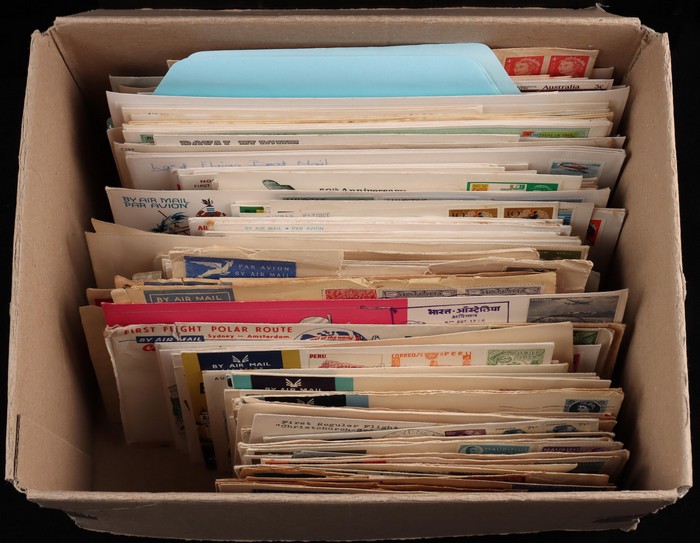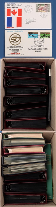 covers 1929-90 large accumulation in 2 small cartons, mostly 1950s-80s inc bulk 1981 Chichester inc diff types, lots of 1948 Qantas World Flight, plus some overseas flights inc NZ & much more. Estimate 100 diff, inc diff frankings, cachets, pmks etc.