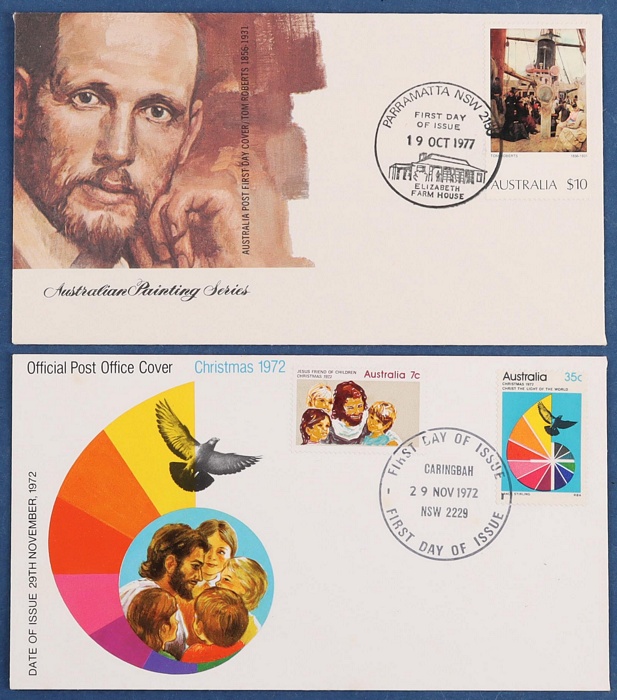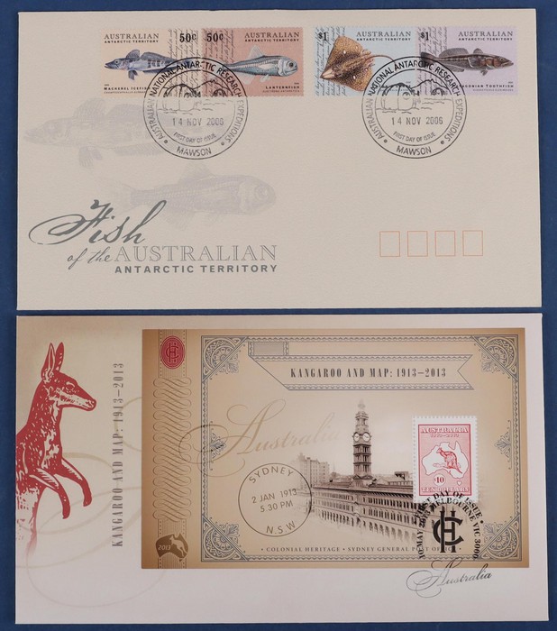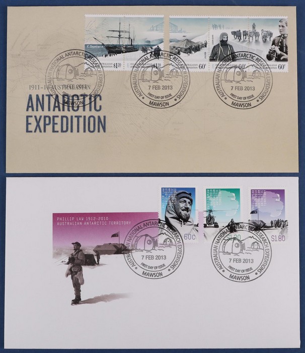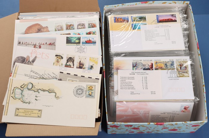 FDC collection in 2 plastic tubs, appear all diff, wide variety inc long Def/Commem sets & Mawson Base Cancels. All fresh & clean, total FV $1650 not inc letter rate envelopes or the 140 1982-90 FDC. (720) (Image1) (Image2)