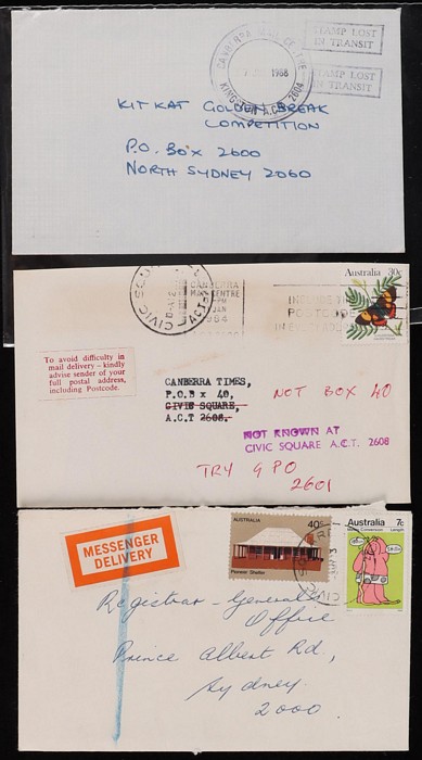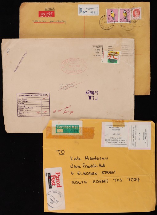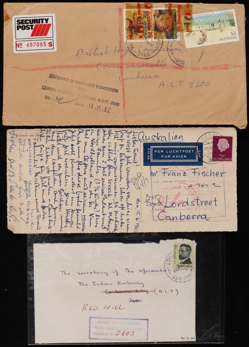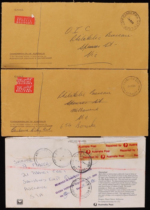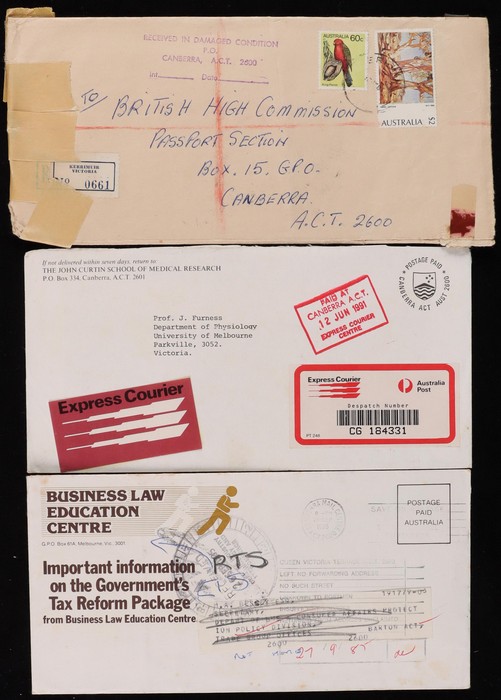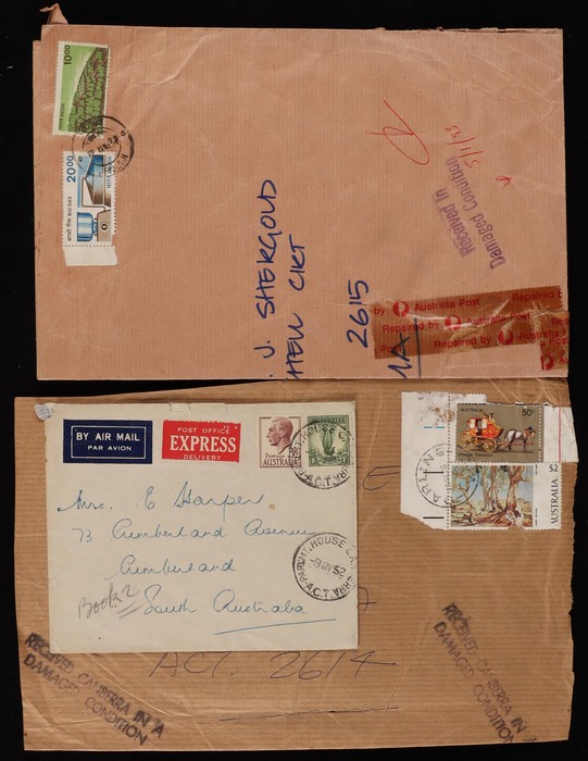 Instructional/Express mail, mainly 1960s-80s with Received Damaged at Canberra (2), Queen Victoria Terrace (2), Woden or unnamed, a few unclaimed markings, Express inc 1952 from Parliament House & 1991 with rare 'Paid At Canberra Express Courier'