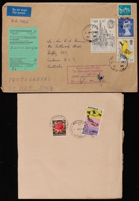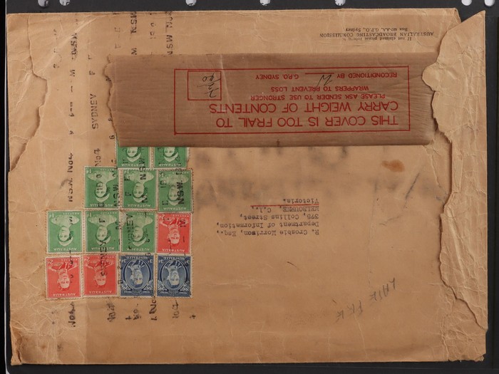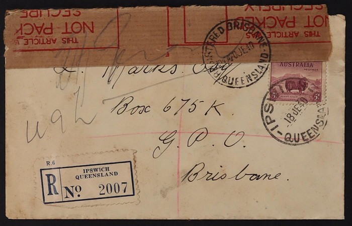 Markings Poorly packaged: 1940 large cover from Sydney with large GPO label ?This cover is too frail to carry weight of contents?, 1940 Ipswich registered cover with Brisbane GPO ?This article not packed securely? & 1983 from Blair Athol with Spencer