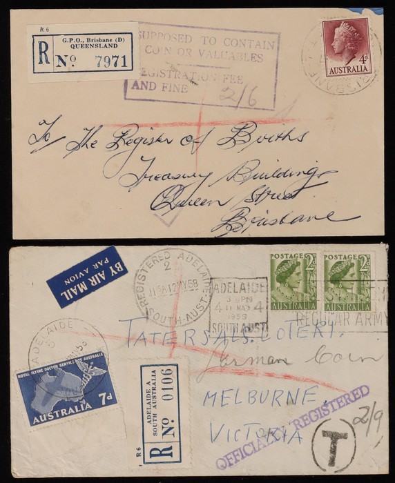 Markings - Registered 'Out of Course', selection of 1940s-50s covers with a variety of cachets inc Launceston 'OR/TP PAY', Irregularly Posted, Supposed to Contain Coin/Money/Valuable Enclosure, 'Out of Course' markings & others. Mostly Taxed,