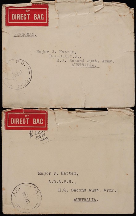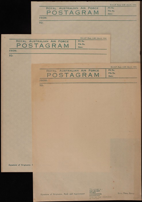 1943-45 Direct Bag/Postagram covers with Direct Bag labels (two diff shades, two roughly opened), 1948 official covers from RAAF Tocumwal or Richmond with 'Open Immediately' label or h/s 'Postagram/Open Immediately', also three unused Postagram