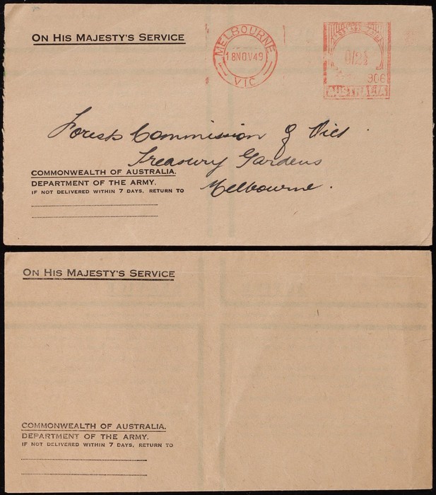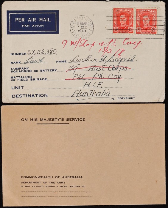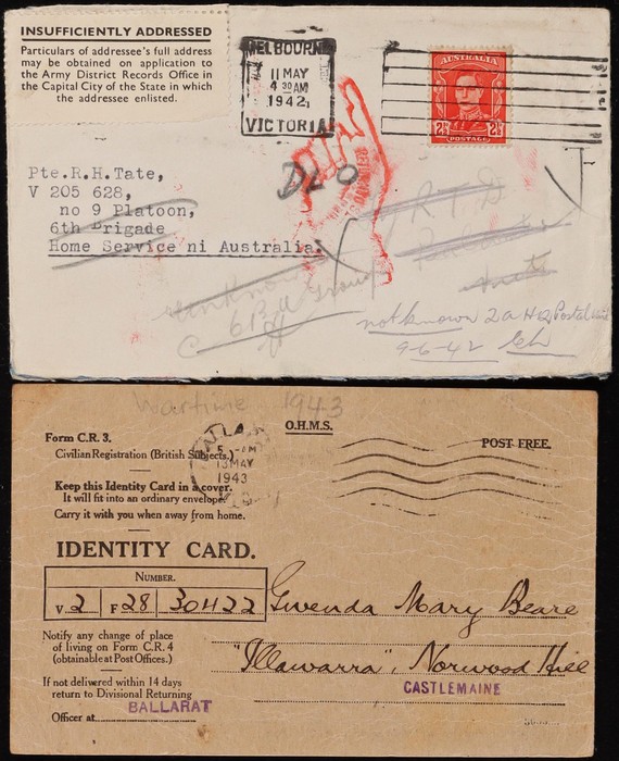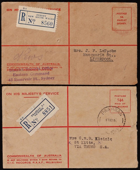 Stationery 1941-49 oddments with 1941 'Postage 5d Paid At Sydney' & 1946 '5½d .at Melbourne' registered envelopes, 1942 with Army Records Office 'Insufficiently Addressed' perforated label, 1949 honour envelopes turned & printed for official