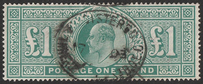 £1 dull blue-green DLR printing. VFU, oval registered pmk. Scott 142 cat US$825. SG 266 cat £825. (P) (Image1)