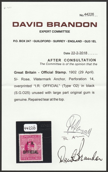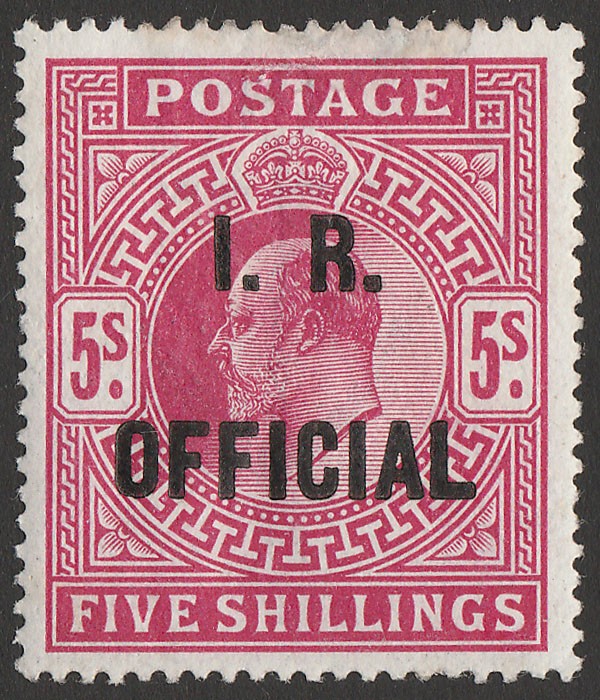 opt KEVII 5/- bright carmine. Fresh M, original gum, expertly repaired tear at top, excellent centring & beautiful bright colour. Scott O24 cat US$42,500, SG O25 cat £38,000 = A75,000. Genuine mint examples are of great rarity as only tiny