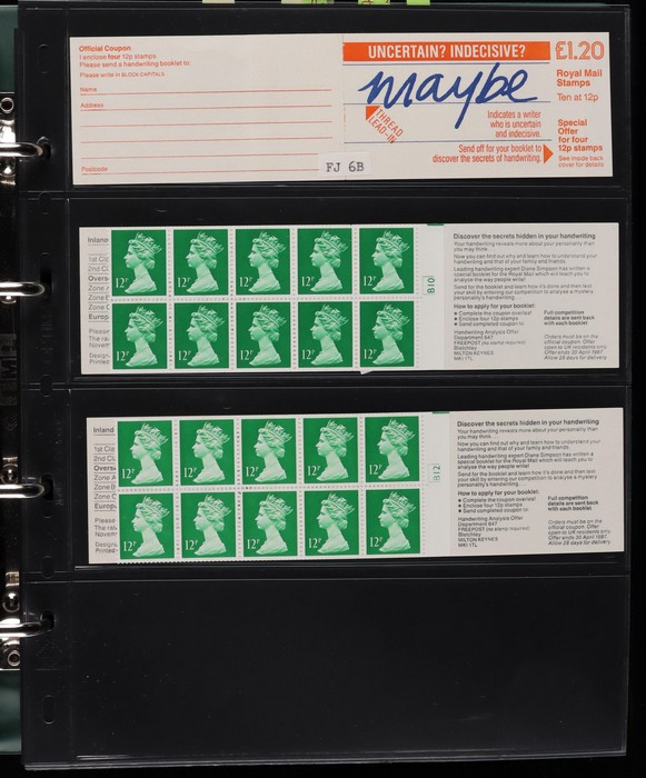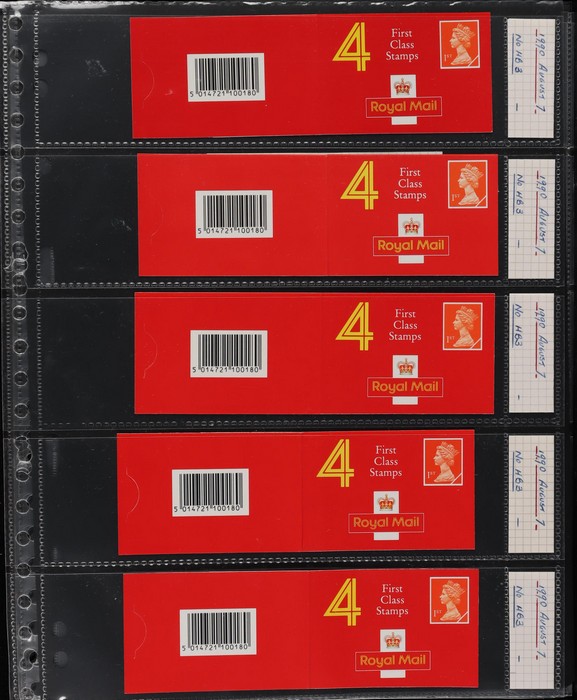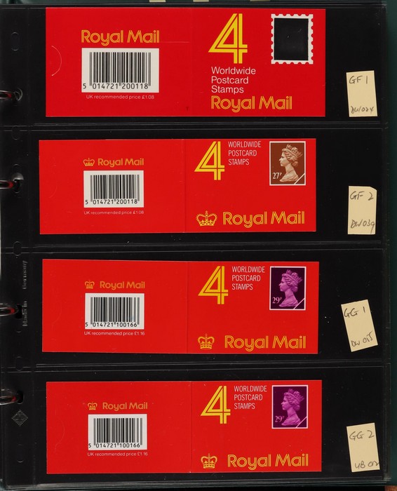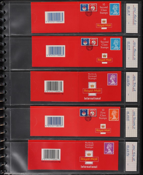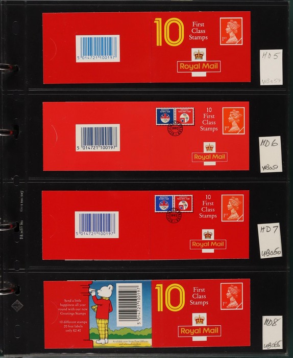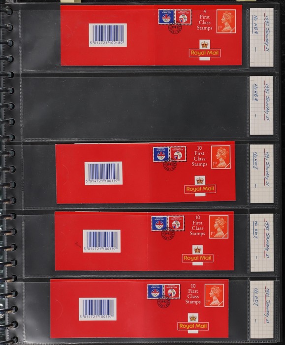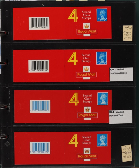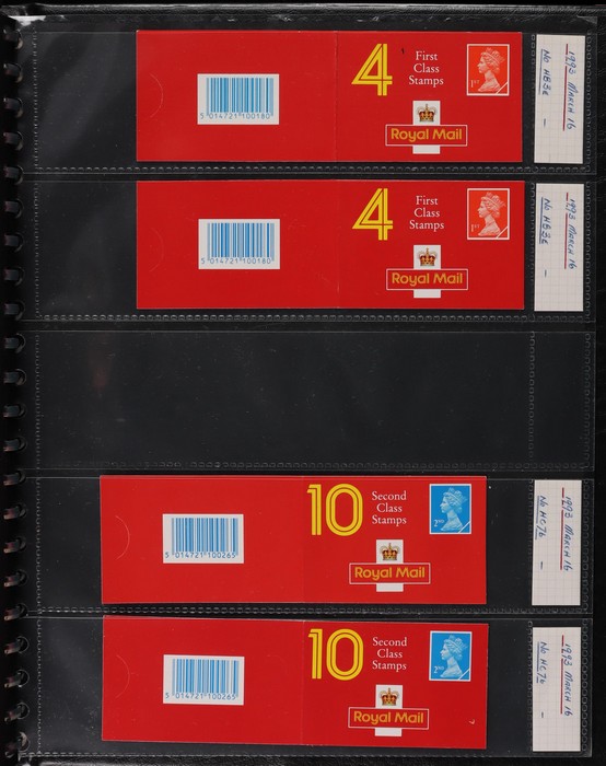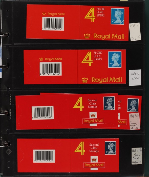 1989-92 in green binder with 2nd Class booklets of 4 stamps SG H4a (2), 2nd Class Barcode booklets in panes of 10 stamps SG HC6a, HC7a, 7b (2), HC9 (2), HC10 (2). 1st Class booklets in panes of 4 SG HB3 & HB3a (2), HB4. 2nd Class booklets in panes pf