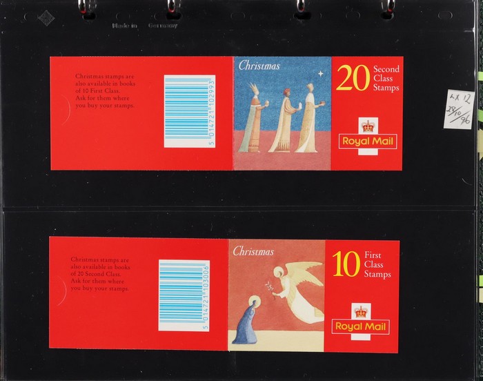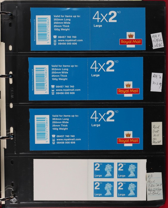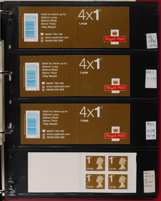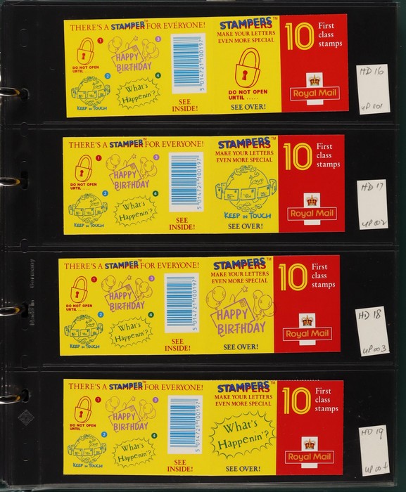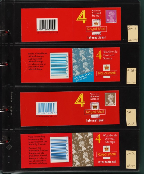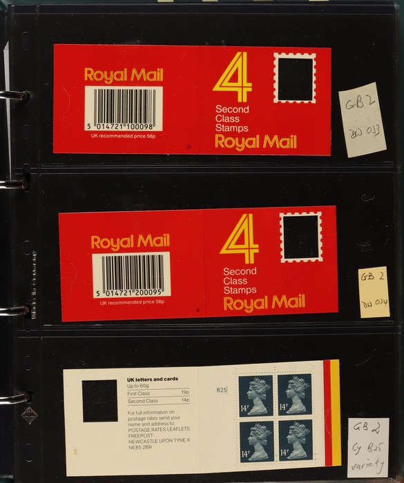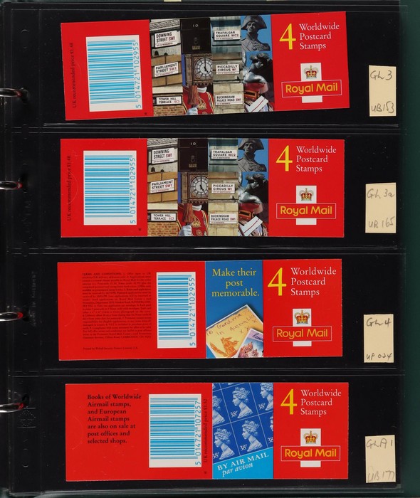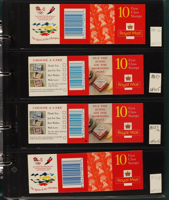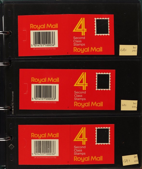 1989-92 in green binder with 2nd Class booklets of 4 stamps SG H4a (2), 2nd Class Barcode booklets in panes of 10 stamps SG HC6a, HC7a, 7b (2), HC9 (2), HC10 (2). 1st Class booklets in panes of 4 SG HB3 & HB3a (2), HB4. 2nd Class booklets in panes pf