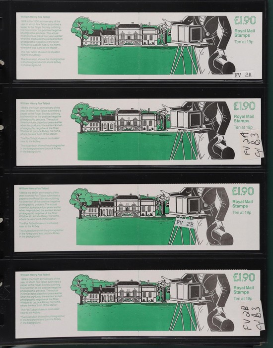 FO1-FO3, £1.50 booklets SG FP1-FP3, £1.54 booklets SG FQ1-FQ4, £1.55 booklets SG FR1-FR4, £1.60/£1.45 booklets SG FS1-FS4, many extras being cylinder panes, varieties A & B types (right & left selvedge) etc. MNH. FV