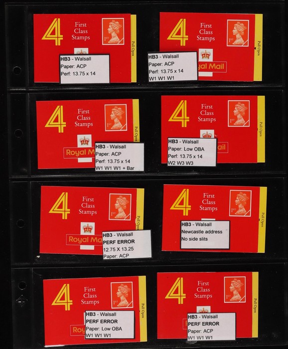 collection Part 21, Machins 1989-93 inc panes of 4, 1st Class stamps SG HB3 (12 booklets) with varieties, perfs, barcode etc. Panes of 10 2nd Class stamps HI7-11 (9 booklets) with varieties of cover, barcode etc. Current FV also £160 = A$330.