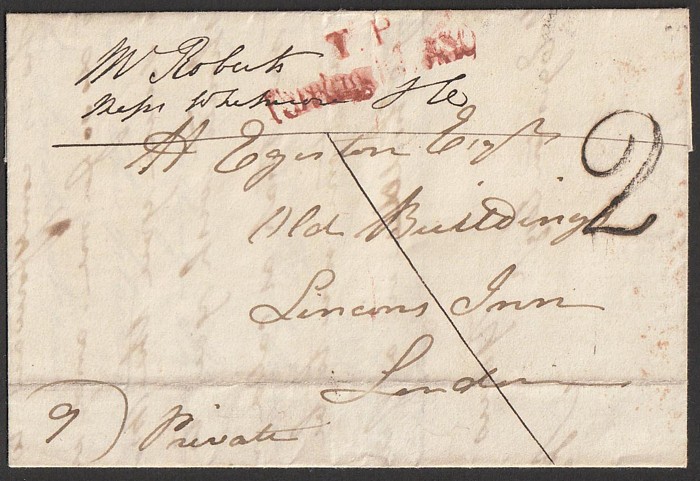 stampless Letter with indistinct 2-line red 'TP' (To Pay) cachet, & h/s '2'. To Lincolns Inn with '2 An 2 SP 1 1841' b/s. (Image1) (Image2)