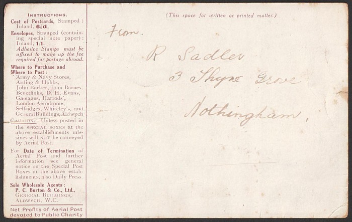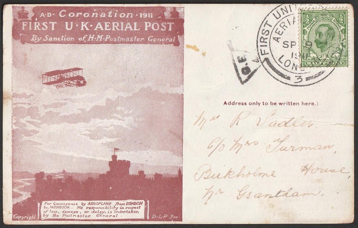 UK Aerial Post pictorial PC in red-brown, franked KGV ½d green tied by 'London SP 9 1911 special pmk'. (Image1) (Image2)