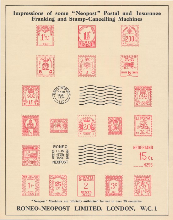sample sheet (210x265mm) with 'Impressions of some 'Neopost' Postal & Insurance Franking & Stamp-Cancelling Machines' with 20 impressions in red inc Australia 1½d, Belgium 1Fr75, Brazil 200R, Egypt 5m, Ethiopia 2g, FMS 6c, GB 1½d &
