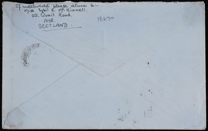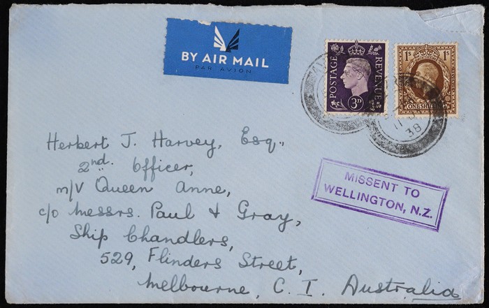 Airmail franked KGV 1/- & KGVI 3d, tied 'Ayr 11 JY 38' cds, single rate, framed 'Missent to Wellington NZ', carried by Imperial Airways flights IE670 when at Sharjah on Jul 16 Corio was involved in a collision with Cooee, Circe took over the mail