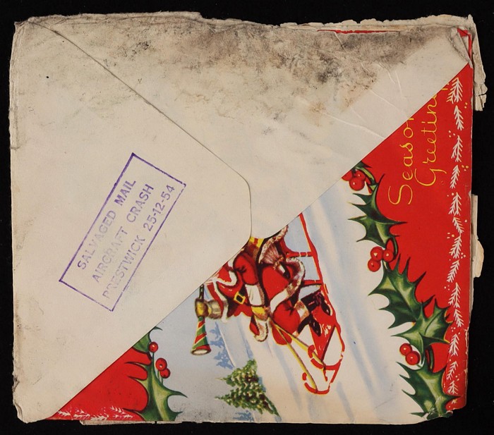 stamps floated away, charred, missing 2 flaps etc, with 'London 23 DEC 1954' pmk. Christmas card to USA, cover with 2 strikes of cachet 'Salvaged Mail Aircraft Crash Prestwick 25 12 54' with another strike on the OHBMS PO envelope used to send to