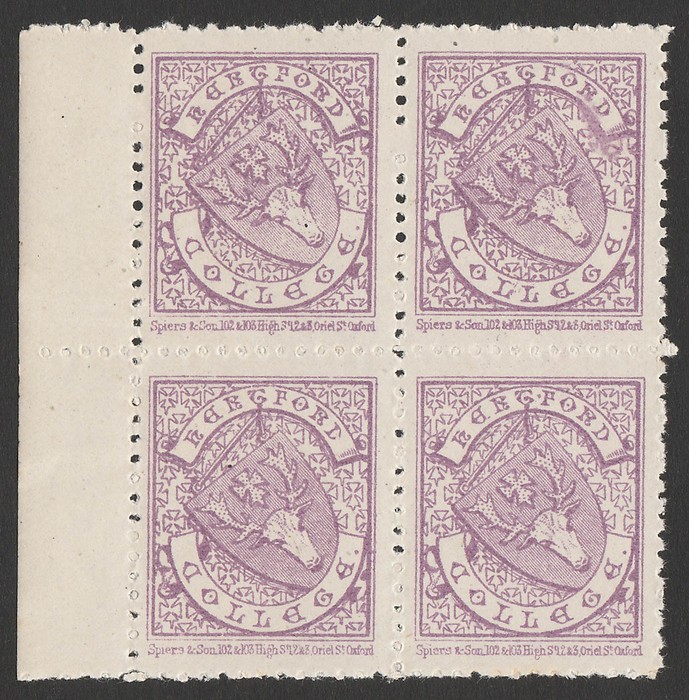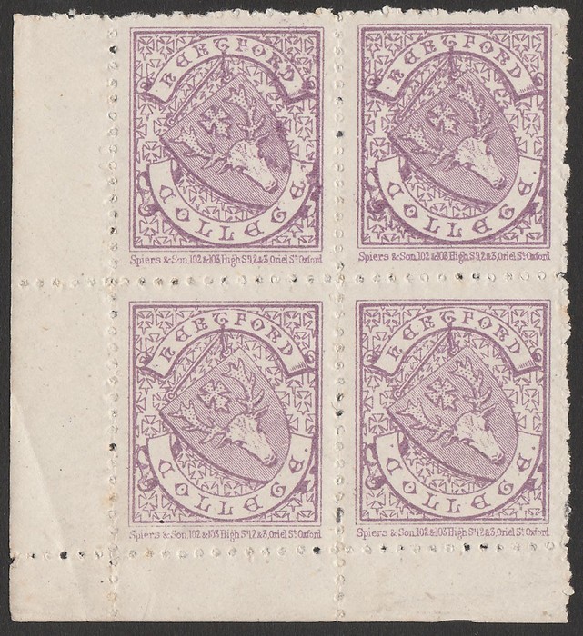 Hertford College (½d) bright mauve Stag Arms, LL cnr marginal blk of 4. Superb fresh 2MLH/2MNH. SG Spec CS4 cat £110 for M, the MNH should be at least double, £165 for this blk. (4). (Image1)