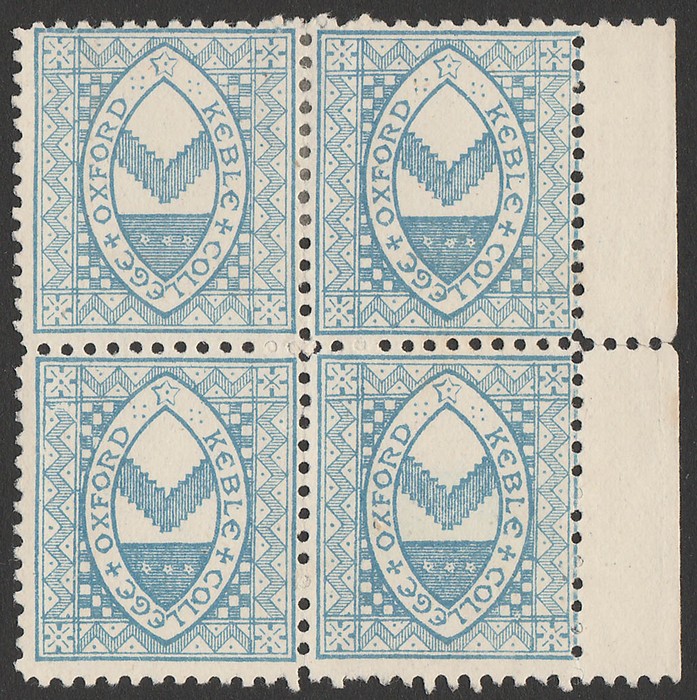 Keble College (½d) ultramarine Arms, no imprint, right marginal blk of 4. VF UN. SG Spec CS10 cat £70. (Image1)