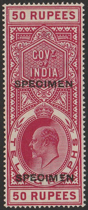 50R rose Die II, opt SPECIMEN. 3 times (18x2mm top & bottom & middle), wmk narrow crown INDIA type20. VF fresh M, paper adhesion. SG T41(s) cat £425 as normal & unpriced as rare specimen. (P) (Image1)