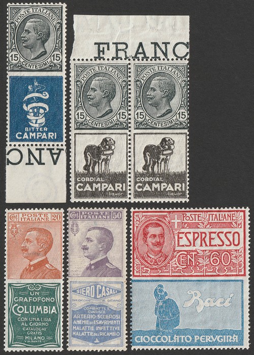 20c, 50c & 60c special issue with se-tenant advertisements (imperf between stamp & advert), selection inc 15c black 'CAMPARI' in blue, 15c black horiz pr 'CAMPARI' in black, 20c orange 'COLUMBIA' in green, 50c violet 'CASALI' in ultramarine, plus