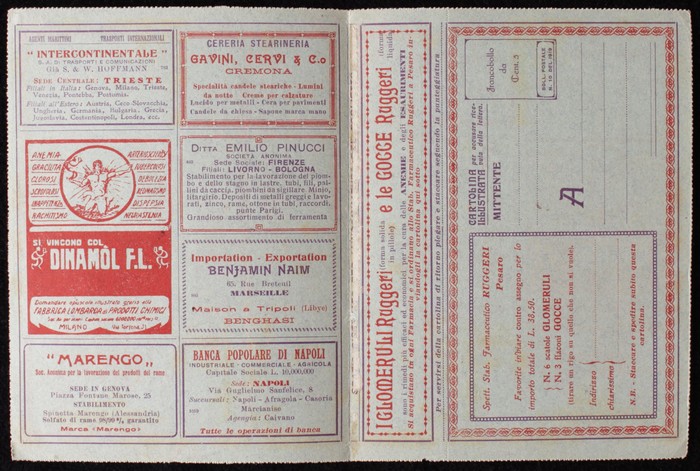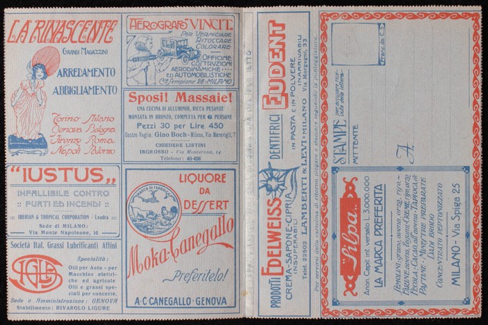Postale' advertising Lettercard (Serie Nazionale 11-20) with advert for 'le Caramelle de Giusti' on front & for 'Stagneol' on back, plus many more inside inc on the writing paper insert. Franked 'BLP' type II litho blue opt 40c brown, also mis-perf