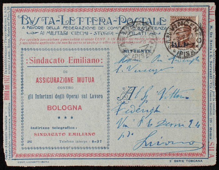 Postale' Advertising Lettercard (2 serie Toscana) with advert for 'Sindacato Emiliano' on front & for 'Guglielmo Boncinelli' etc on back & many small adverts inside, franked BLP type I litho blue-black opt 40c brown. VFU tied by 'San Vincenzo 8 7 22'