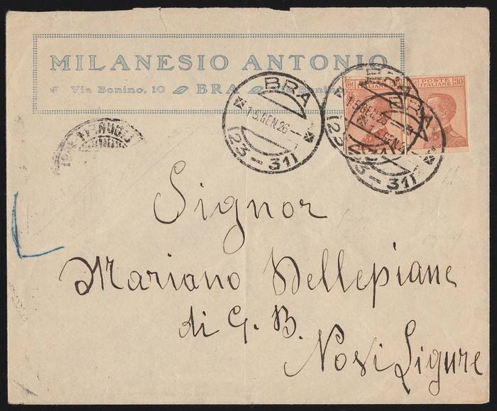 flap) franked King 30c orange IMPERF Postcard cut-outs (2) tied by 'Bra 15 GEN 26' cds. To 'Novi Ligure' arrival b/s. Rare provisional usage. Exp Alberta Diena. (Image1)