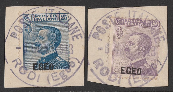 Rodi: 1912 'EGEO' opt King set 25c blue & 50c violet. VFU, on piece with 'Poste Italiane 6 GEN 1913 Rodi (Egeo)' cds. SG 1-2 cat £88+, Sass 1-2 cat €120+, plus premium for pmks. (2) (Image1)