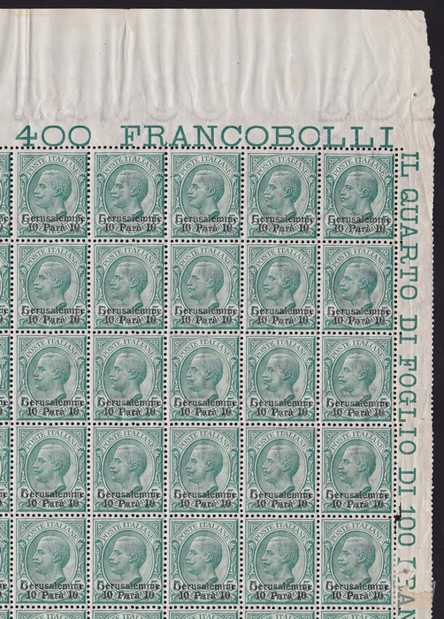 1909-11 'Gerusalemme' opt 10pa/5c green, FULL SHEET of 100. VF fresh MNH, sheet margins all round. SG 125 cat £1100 for M, should be at least double, £2200 MNH, plus premium for full sheet. Sass 1 cat €2500 = A$4100+ MNH singles,
