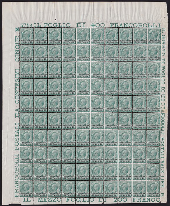 1909-11 'Gerusalemme' opt 10pa/5c green, FULL SHEET of 100. VF fresh MNH, margins all round. SG 125 cat £1100 for M, should be at least double, £2200 MNH. Sass 1 cat €2500 MNH singles -both, plus premium for sheet & very rare thus.