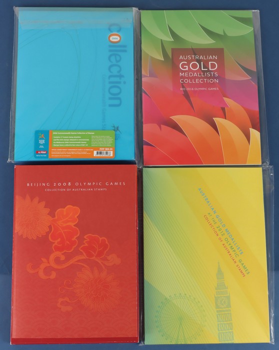 634 imageOlympics: 2008 Beijing, 2012 London inc Jared Talent (Number 8) & 2016 Rio Gold Medallists M/Sheet albums plus 2006 Melbourne Commonwealth Games folder. Fresh MNH, FV $300+. (Image1)