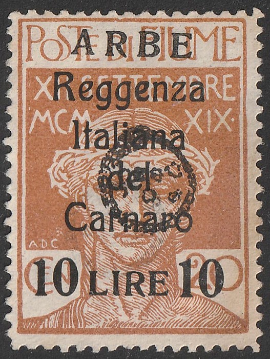 small ARBE opt 10c red error whole opt INVERTED. VFU with 'Arbe 8 X 20' cds. SG 2B(var). Sass 6a cat €700. Very rare probably as only 2 rows printed. (P) (Image1)