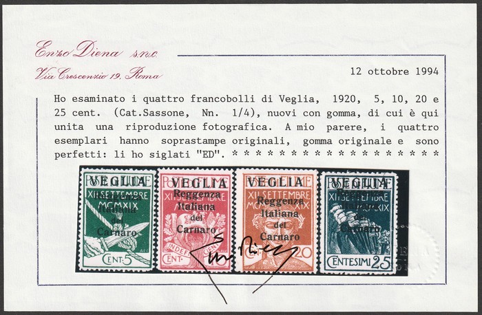 large VEGLIA opt set 5c-25c. Superb fresh MLH. Scott 128a-31a cat US$2075. SG 1A-4A cat £2225. Sass 1-4 cat €3200. Rare genuine as only 450 sets printed, & most were used. 1994 Enzo Diena & 2024 Ceremuga AIEP photo-certs. (4). (P) (Image1) (Image2)