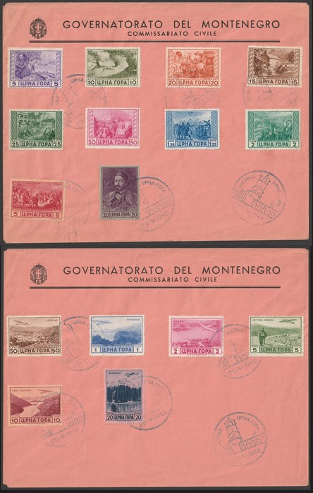 National Poem sets 5c-20L Postage & Airmail sets tied to Official envelopes by 'Cetinje 25 V 1943' violet pictorial cds. VFU. SG 60-75 cat £150+ as loose stamps. Sass 60-69 & PA26-31 cat €1300 for sets on covers. Very rare. 2024 Ceremuga