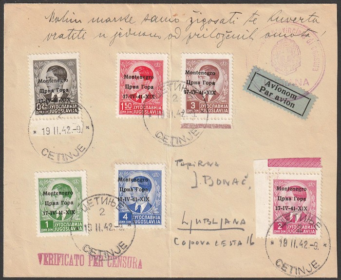 bilingual 3-line opt King 25c-4D on Censored cover (centre fold), tied by 'Cetinje 19 11 42' cds, to Ljubljana with 2 censor cachets. SG 1-6. Sass 1-6 cat €84+ as loose stamps & €220 for this franking. (P) (Image1) (Image2)
