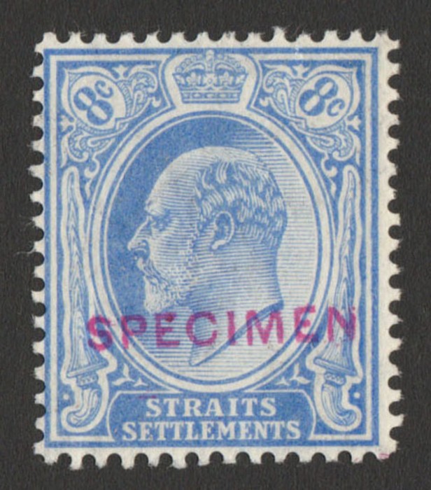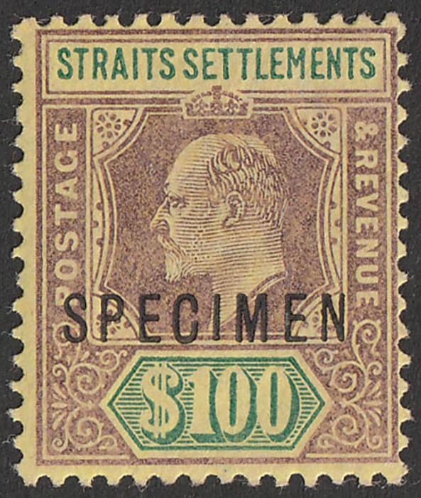 purple & green/yellow, wmk crown CA, opt SPECIMEN. VF fresh M, nice deep colour. Scott 104A cat US$800, SG 122s cat £800 (normal cat £22,000). (P) (Image1)