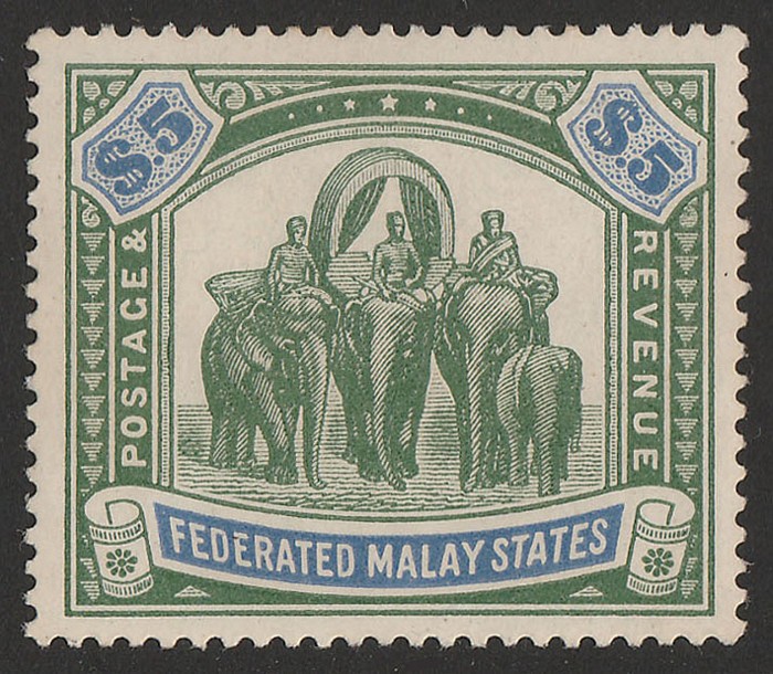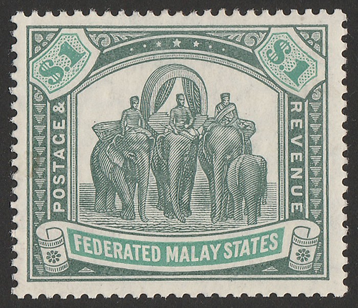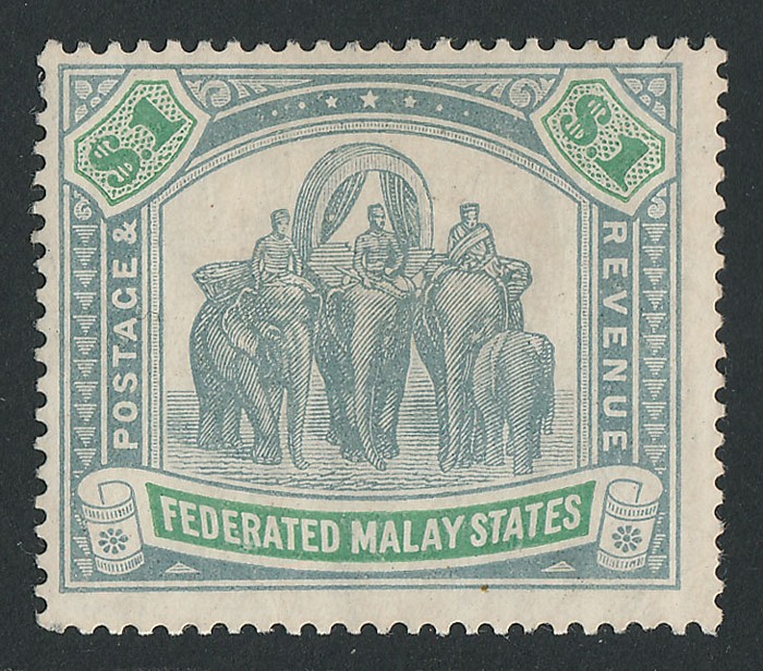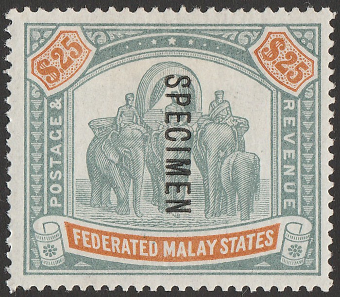 Elephants $25 green & orange top value. Superb fresh M, nice original gum & beautiful colours. Scott 13A cat US$15,500, SG 14 cat £17,000+. The key stamp of all of all the Malayan States Elephant issues. Major rarity genuine mint in such nice
