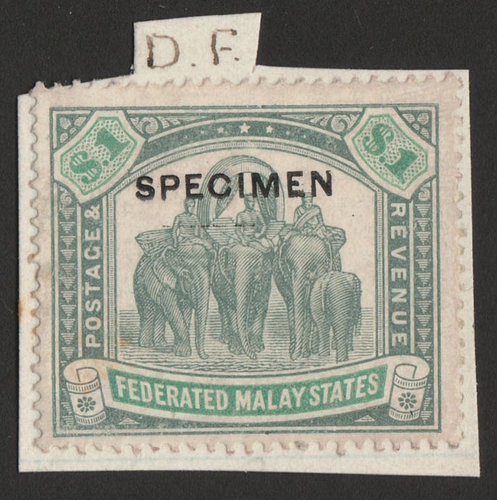 Elephants $1 grey-green & green wmk mult crown, opt SPECIMEN sans-serif opt type D12 (15x2mm). F-VF M affixed on piece. SG 48s(var) cat £130 as normal. Unique specimen type example from DLR archives. (P) (Image1)