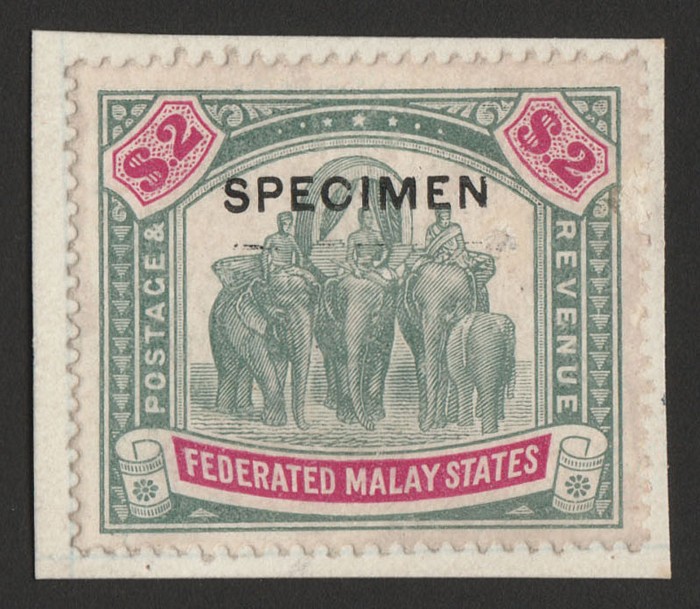 Elephants $2 green & carmine, wmk mult crown, opt SPECIMEN sans-serif opt type D12 (15x2mm). VFM affixed on piece. SG 49s(var) cat £140 as normal. Unique specimen type example from DLR archives. (P) (Image1)