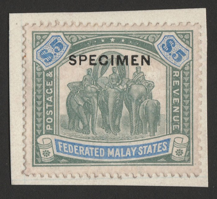 Elephants $5 green & blue, wmk mult crown, opt SPECIMEN sans-serif opt type D12 (15x2mm). VFM, affixed on piece. SG 50s(var) cat £350 as normal. Unique specimen type example from DLR archives. Certificates for any of these specimen opt rarities