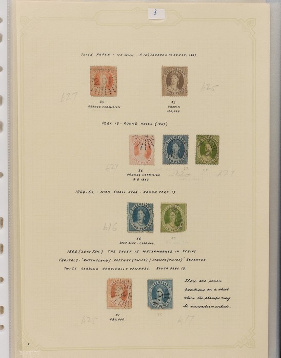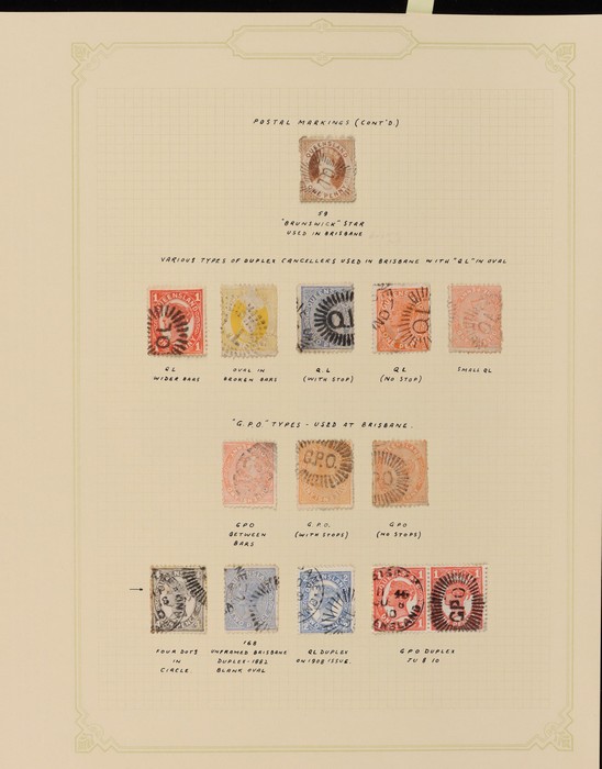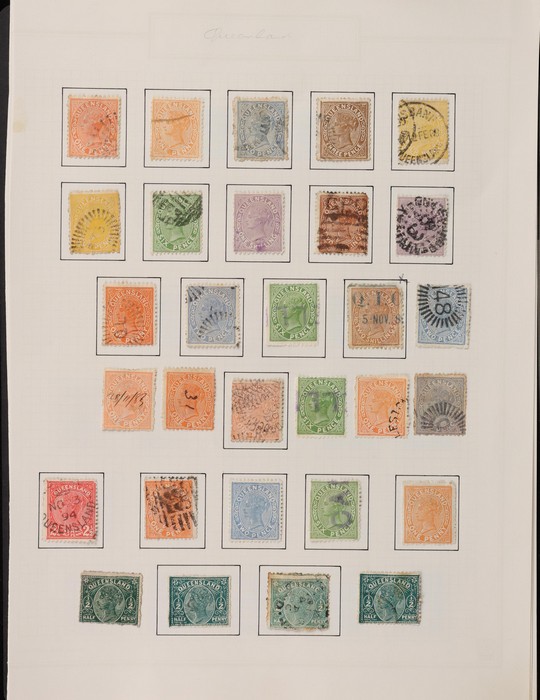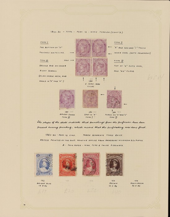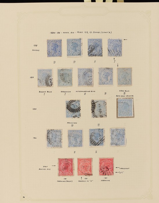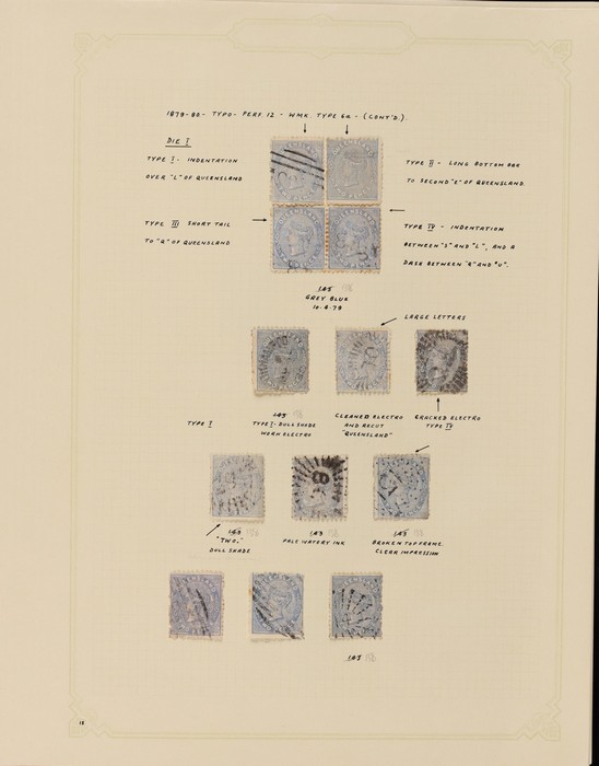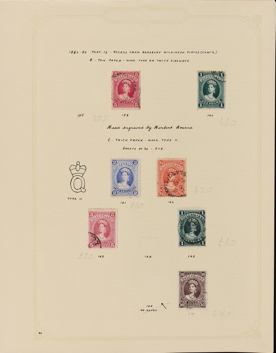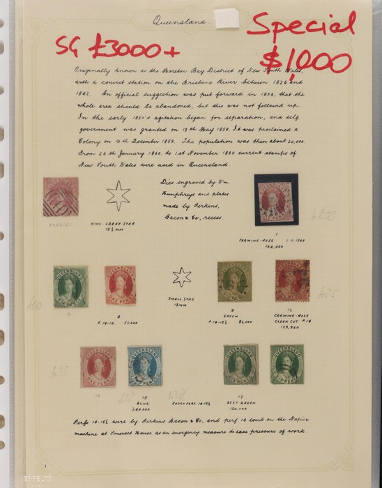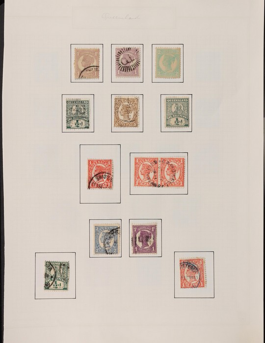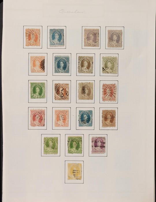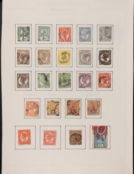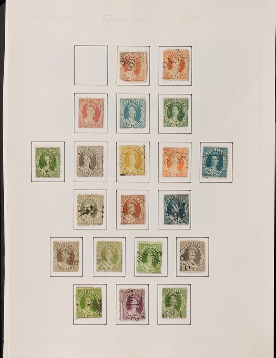 665 imageQueensland: 1860-1912 specialised collection on pgs with annotated notes inc varieties & shades inc 1860 QV Chalon 1d imperf. 1860-80 QV Chalons to 1/- laid out according to wmk & perfs with shades. 1879-80 QV 1st Sideface to 1/- inc types & shades. Annotated varieties. 1882-95 QV Large Chalon to £1 inc wmks. 1882-90 QV solid backgrounds to 1/-, plus shades & perfs. 1897-1907 QV 4 cnr numerals, to 2/- plus shades. Also useful selection of pmks inc usage in other states. Mostly G-VFU, odd M, some mixed. SG cat £4600+ = A$9000+. (725) (Image1) (Image2) (Image3) (Image4) (Image5) (Image6) (Image7) (Image8) (Image9) (Image10) (Image11) (Image12) (Image13) (Image14) (Image15) (Image16) (Image17) (Image18) (Image19) (Image20) (Image21) (Image22) (Image23) (Image24) (Image25)