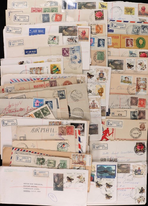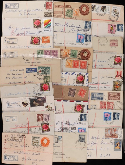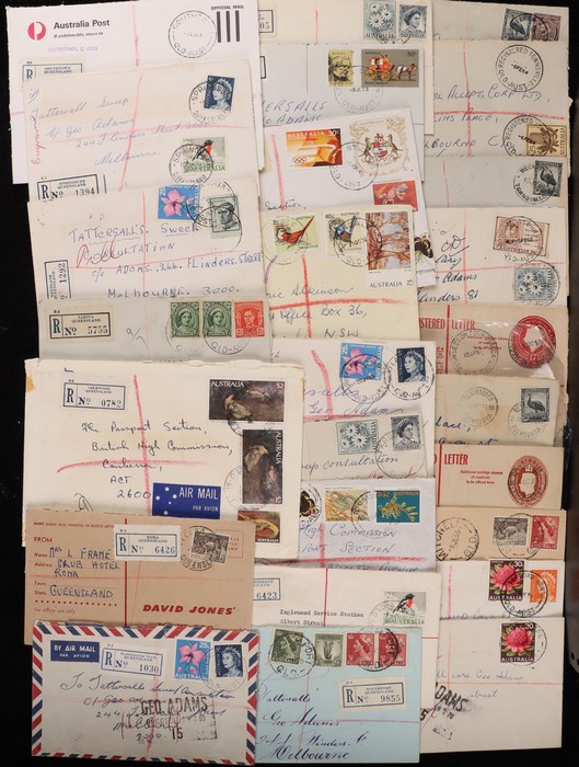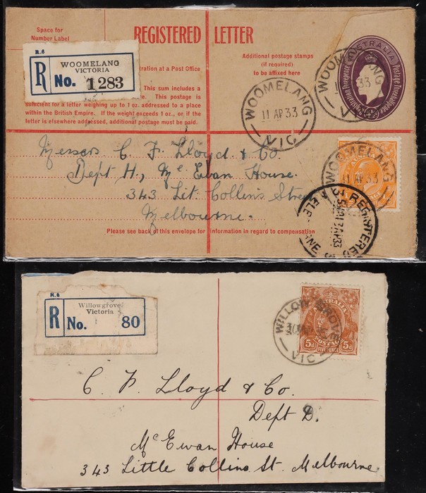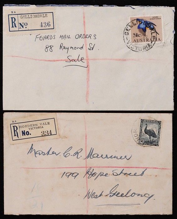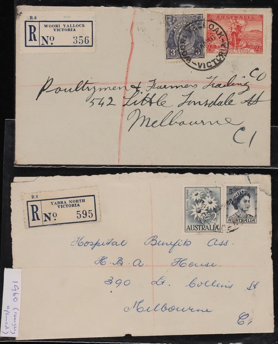 675 imageVictoria Registered Mail: Huge collection of registered covers sorted by label types, stated all diff, from 1930s-80s but majority from early 1950s to early 1970s with blue labels, includes A1 Mine Settlement, Altona Nth (2) & West, Anderson RS, Ararat Nth & Sth, Archerton, Arnold, Arthur's Creek, Ascot Vale Central, East & West, Avonsdale, Axedale, Bairnsdale East, Balmattum (R.) (front), Bambra Rd, Bambra Rd Sth, Banyena, Beauville, Bell Park, Benjeroop, Bennison, Bentleigh Nth (2), Berrybank, Bleak House, Bolwarrah (2), Booran Rd, Boorhaman, Brighton - North Rd, Were St & West, Bullarto, Bullen West, Burleigh (2), Byaduk Nth, Camp Pell, Cannie, Cape Otway, Cardigan, Carlsruhe RS, Carranballac, Castella, Cathkin, Childers, Chinkapook, Christmas Hills, Clarinda, Cliffside, Clonard, Clyde, Codrington, Coghills Ck, Colac East, Colginabbin West, Combeinbar, Coomboona, Coragulac, Crimea, Cross Keys (3), Cudge, Cumberland Park, Dendy, Diggora West, Draytonville, Dutton Way, Echuca Sth, Elgar Park (2), Eltham Nth, Ensay Sth (front), Essendon Aerodrome & Airport, Faversham, Fentons Creek (2), Fishermans Beach, Footscray - Argyle St, Ballarat Rd (5), Geelong Rd (3) & Park (2), Fortuna, Galah, Gardner, Gelliondale, Gilbank (2), Gilderoy, Glenalbyn (Rail), Glengala, Glenmaggie, Glenroy Sth, Granya, Greythorn, Hattah, Healesville West, Heatherdale, Hernes Oak, Hicksborough, High Camp Plain (2), Highton, Hillside, Hordern Vale, Horsham Nth, Sth (2) & West, Hunter, Invergordon, Iona, Ivanhoe East & West, Jacana, Jumbunna, Katandra, Kerrisdale (Rail), Kiata, King Valley, Kongwak, Kurting, Ky Valley, Lake Charm Rail, Licola, Lillimur Sth (2), Lima Sth, Lindenow Sth, Lyndhurst, Macclesfield, Maribyrnong, McKillop, Merri (2), Metropolitan Farm, Mittyack, Modewarre, Moondara, Mordialloc Nth (2), Morwell - Bridge, East & Upper, Mt Buffalo Chalet, Mt Moriac Mt Waverley Nth (2), Munro, Murray Lock No 9, Napoleons, Navigators, Nelsons Hill, Nerrina (front), Newhaven, North Blackburn (2), Pedrina Park, Pennydale (2), Petersons, Pirron Yallock, Poolaigelo, Portland West, Redesdale, Reservoir Eat, Ross Bridge, Seaholme (2), Sinclair (2), Smith Gully Rd, South Blackburn, South Purrumbete, Springmount, Steiglitz, Sylvester (3), Tahar, Taranginnie, Tarranyurk, Teddywaddy, Toolondoo, Toolong, Tottenham East (2), Tyabb, Tyntynder Central, Tysons Reef, Waaia, Wandong, Wangaratta West, Warrambook - East, Nth, Sth & West, Wensleydale, Western Camp (2), Whitfield, Whittington, Williamstown Beach, Willow Grove (2), Wollert, Woodfield & Yabba Nth. Many in the A-G letters with cds rarity RR-RRRR noted on reverse. Mostly F-VF. This collection is an amazing effort that took very many years to achieve. This collection was previously offered but the vendor has subsequently added another 115 items to it. (1800-1850 covers). (Image1) (Image2) (Image3) (Image4) (Image5) (Image6) (Image7) (Image8) (Image9) (Image10) (Image11) (Image12) (Image13) (Image14) (Image15) (Image16) (Image17) (Image18) (Image19) (Image20) (Image21) (Image22) (Image23) (Image24) (Image25) (Image26) (Image27) (Image28) (Image29) (Image30) (Image31) (Image32) (Image33) (Image34) (Image35) (Image36) (Image37) (Image38) (Image39) (Image40) (Image41) (Image42) (Image43) (Image44) (Image45) (Image46) (Image47) (Image48) (Image49) (Image50) (Image51) (Image52) (Image53) (Image54) (Image55) (Image56) (Image57) (Image58) (Image59) (Image60) (Image61) (Image62) (Image63) (Image64)