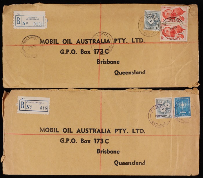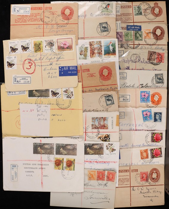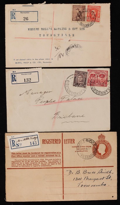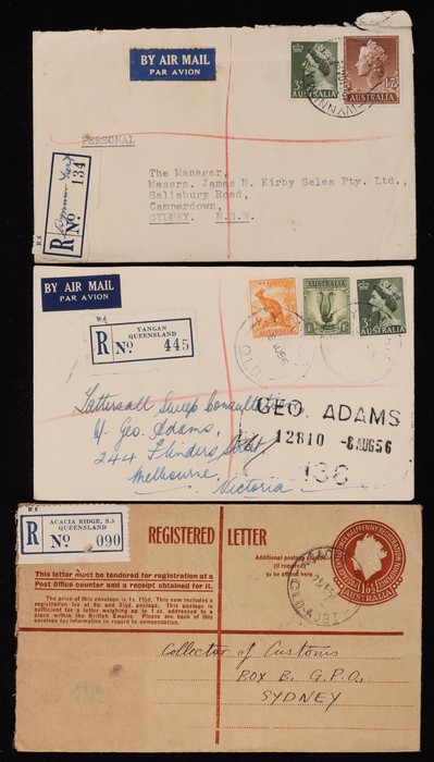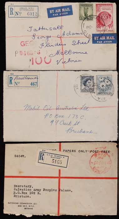 667 imageQueensland Registered Mail: Useful lot mainly 1940s-80s sorted by label, stated all diff, inc Acacia Ridge, Alderley, Arran, Boolboonda, Boonarga, Bribie Is, Chardons Cnr, Cordelia, Finch Hatton, Gargett, Gaythorne, Gladstone, Harrisville, Mackay Sth, McKinlay, Middle Ridge, Murray Upper, Selwyn, Stafford Nth, Toowoomba City Nth, Wynnum Nth & Yangan, noted quite a few short lived Qld type black & blue labels in 1940s. (230+) (Image1) (Image2) (Image3) (Image4) (Image5) (Image6) (Image7) (Image8) (Image9) (Image10) (Image11) (Image12) (Image13) (Image14)