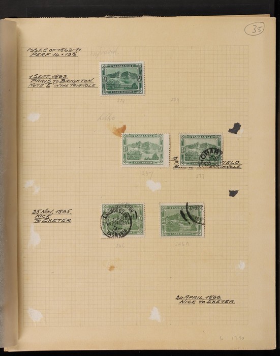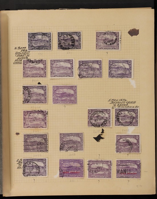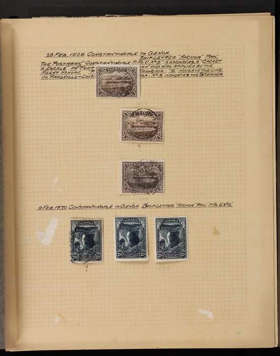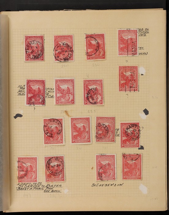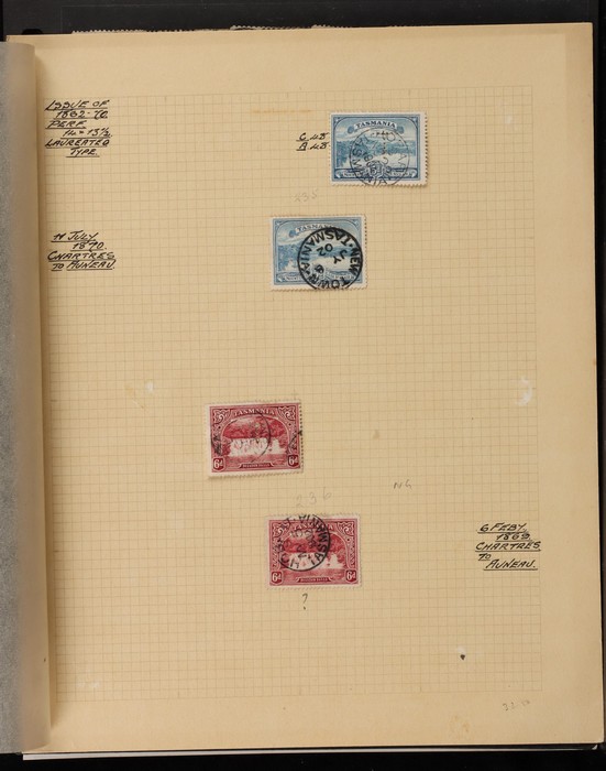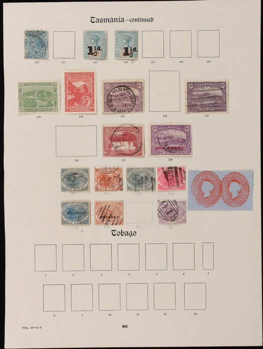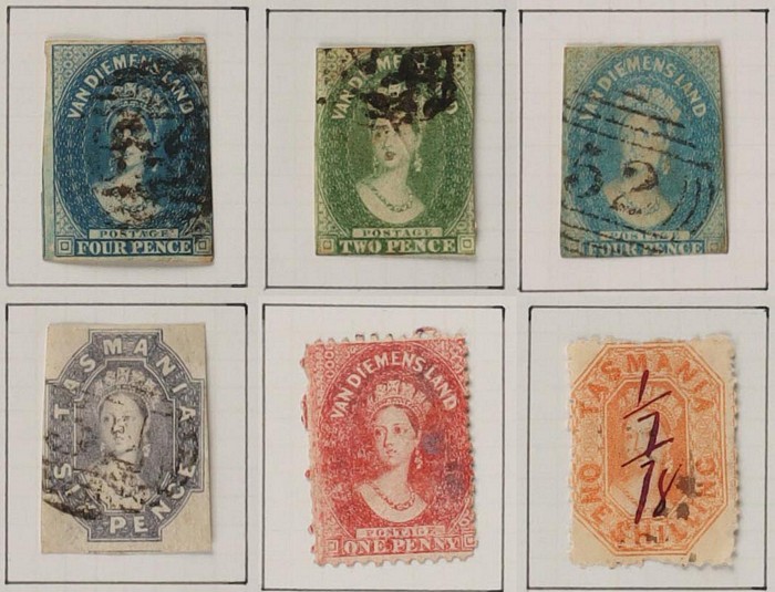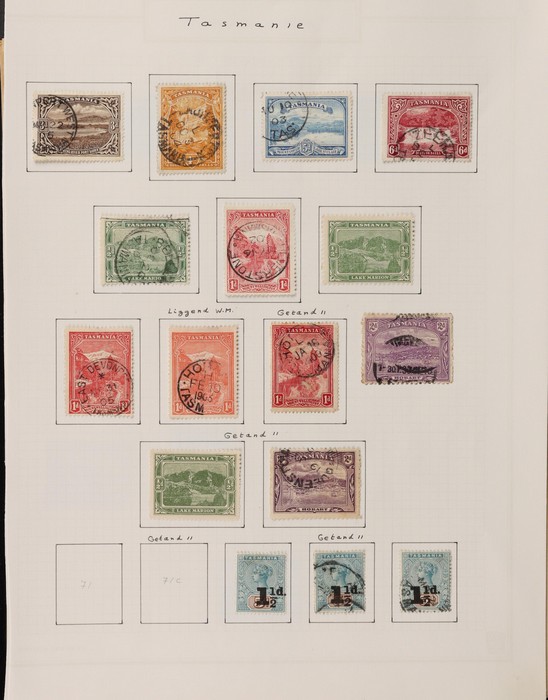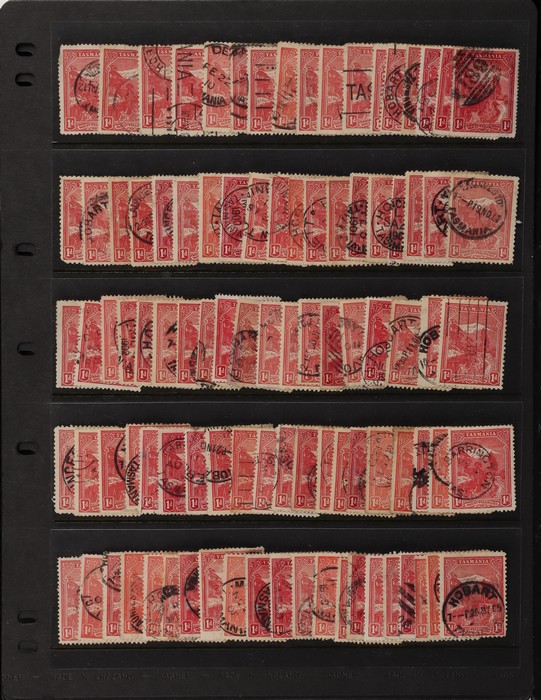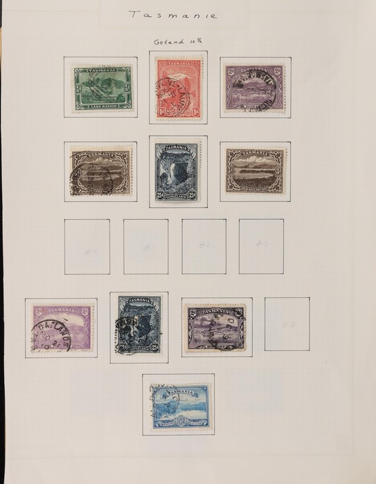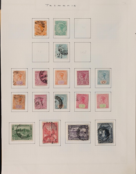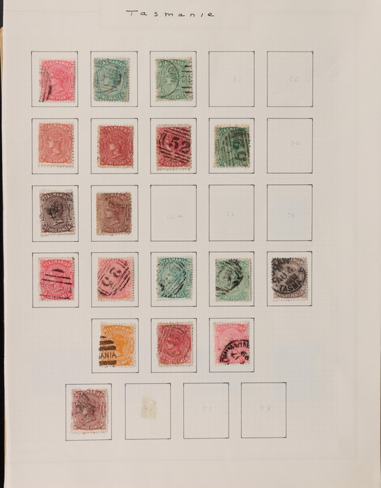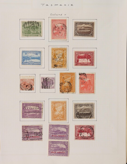669 imageTasmania: 1853-1912 collection on old album pgs inc 1853-54 QV Courier 4d. 1855 QV Chalon 2d & 4d (2 shades) wmk Large star. 1857-67 QV Chalon vals to 6d, imperf inc shades. 1863-71 QV Chalon 4d serrated perf 14. 1863-91 QV Chalons to 1/- perf. 1892-99 QV Tablets to 5/-. 1899-1900 Pictorial to 6d M plus later printings. 1880 Platypus Stamp Duty set to 1/-, with postal pmks. Mostly G-VF M/U, mixed in parts as usual. SG cat £2000+ = A$4000. (86) (Image1) (Image2) (Image3) (Image4)