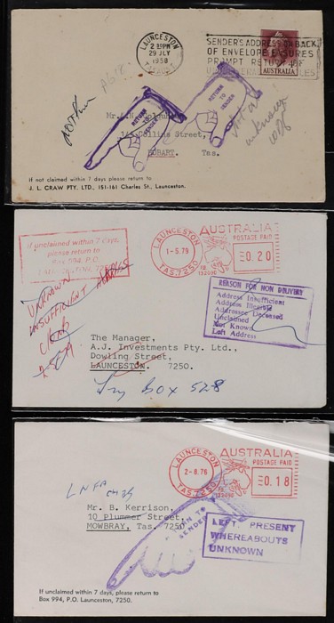 672 imageTasmania Instructional Markings: 1920s-80s range of covers from KGV but strength in 1970s-80s with a few received damaged, open, repaired markings, many RTS sorted by town inc 2 with large Postman check boxes, also 'your correct address' markings, repaired by tapes etc, little duplication of types (55). (Image1) (Image2) (Image3) (Image4) (Image5) (Image6) (Image7) (Image8) (Image9) (Image10) (Image11)