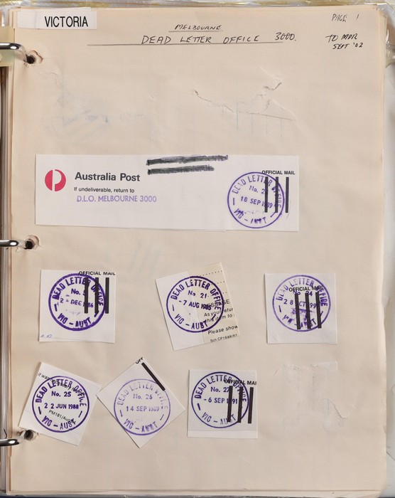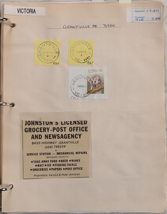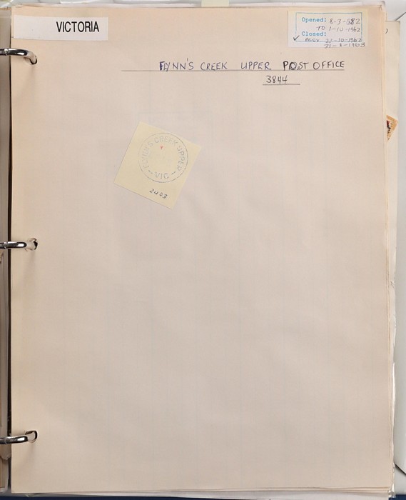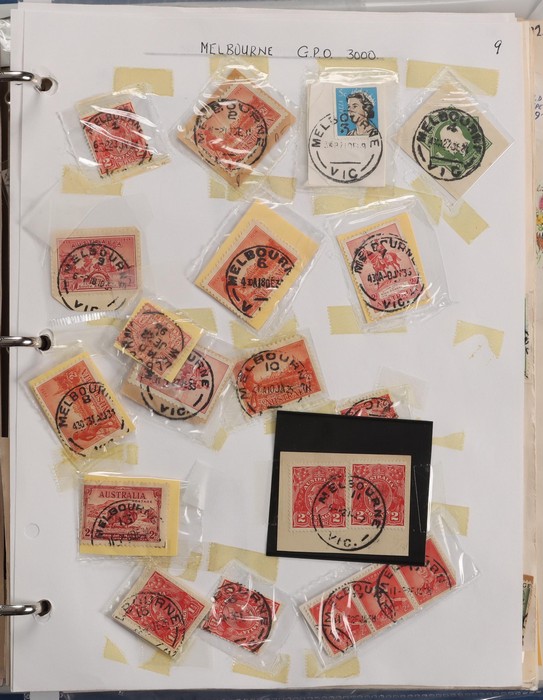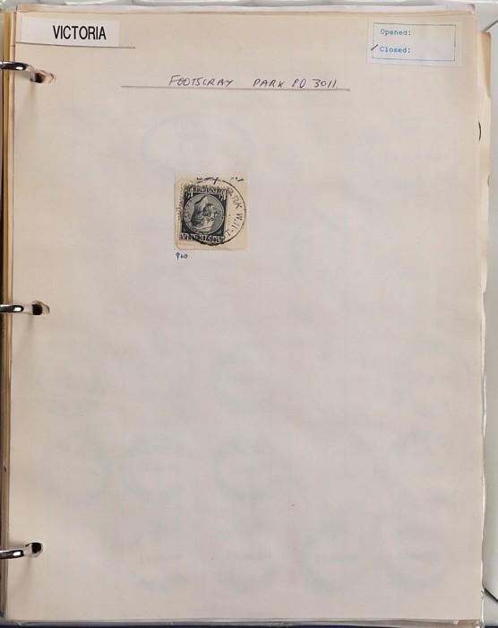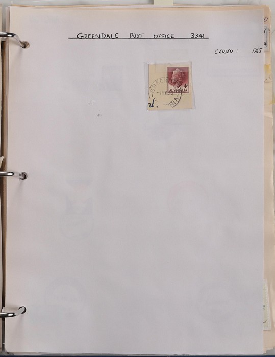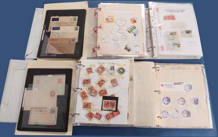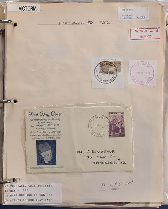 677 imageVictoria 1890s-1990s postmark collection F-M, mainly on piece on pages in 4 binders. Each PO has opening & closing dates. Some FDC, 8 other covers & PO Picture PCs throughout. Noted Flynns Creek Upper, 1953 Footscray Park, Gilbank, Gee Gee South, Greendale Manor, Mary Knoll 1955 3½d Nursing FDC with very unusual caption 'Blessed at Mary Knoll by Dr Mannix' (Catholic Archbishop of Melbourne). A lot of scarcer Dead Letter, postal manager, paid cds & folder of WWII Military covers. A lot to work on. (est several 1000s). (Image1) (Image2) (Image3) (Image4) (Image5) (Image6) (Image7) (Image8) (Image9) (Image10) (Image11) (Image12) (Image13) (Image14) (Image15) (Image16) (Image17) (Image18) (Image19) (Image20)