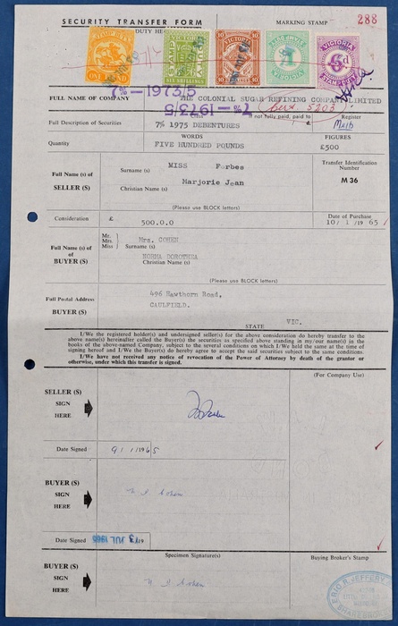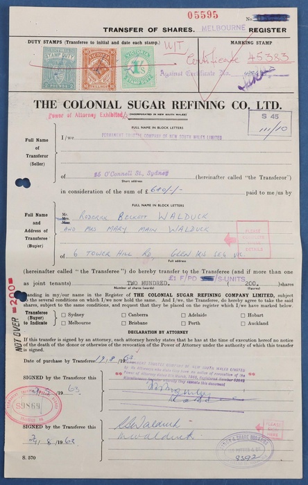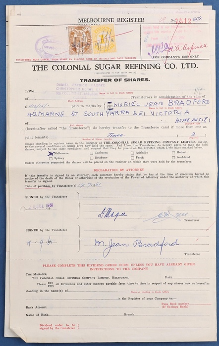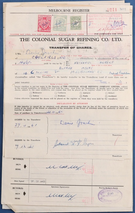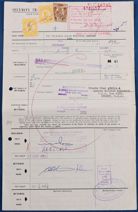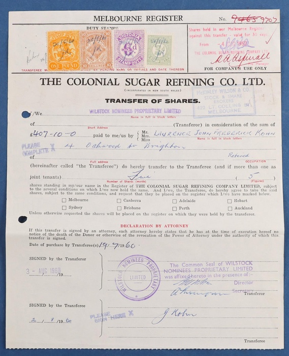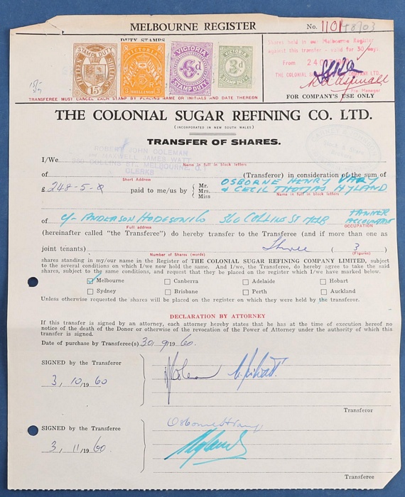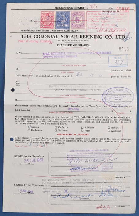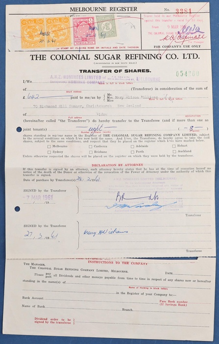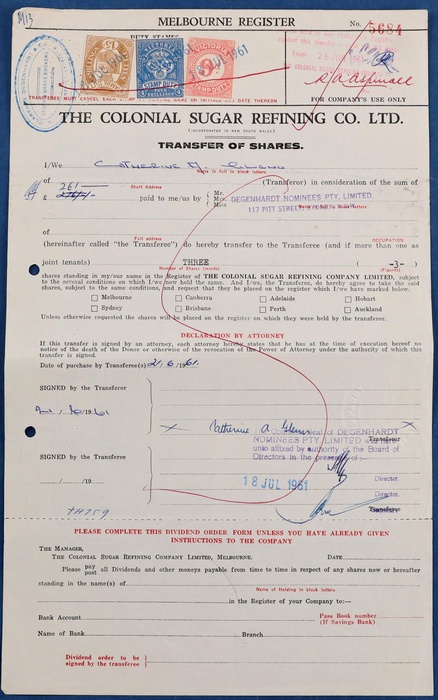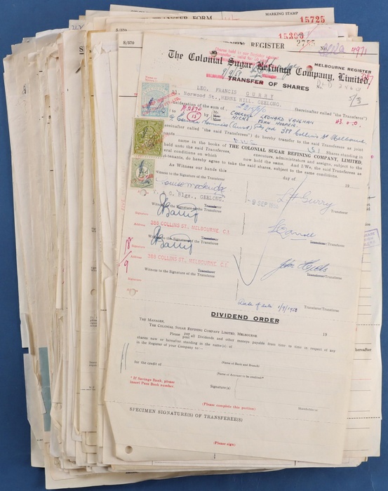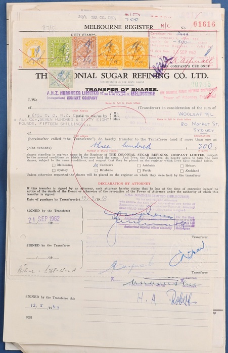 682 imageVictoria - Revenues: 1960s Colonial Sugar Refinery Co share transfer certificates with a range of vals from 9d pink single franking to £2 blue inc multiple frankings of up to 5 stamps. Approx 200 certificates inc a few with decimals attached or with 'Not Chargeable with Stamp Duty' cachets. (Image1) (Image2) (Image3) (Image4) (Image5) (Image6) (Image7) (Image8) (Image9) (Image10) (Image11) (Image12) (Image13) (Image14) (Image15) (Image16) (Image17) (Image18) (Image19)
