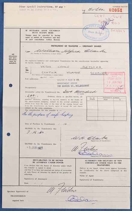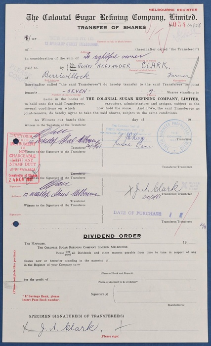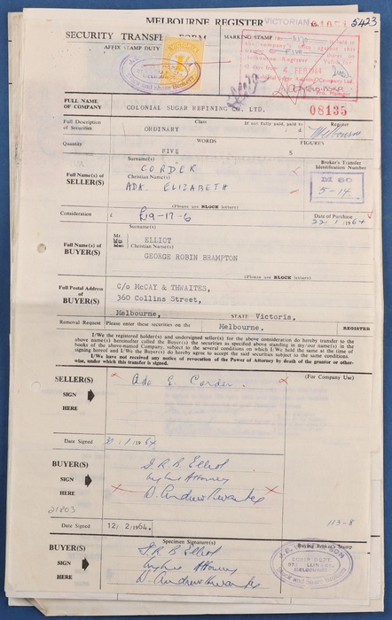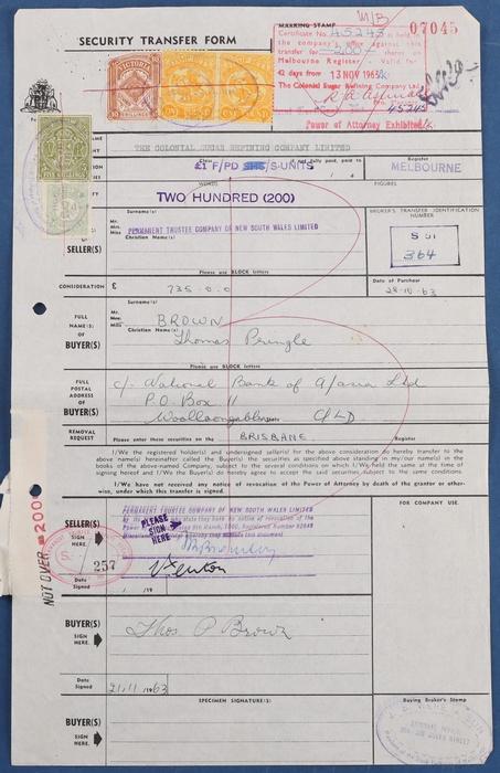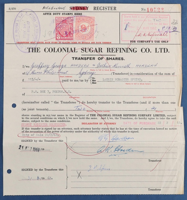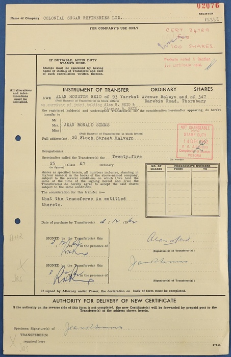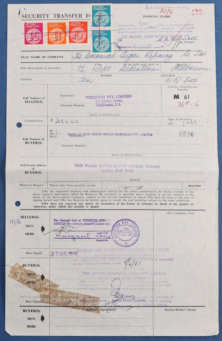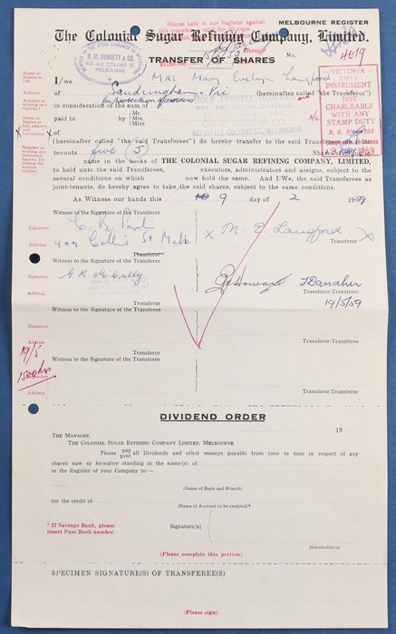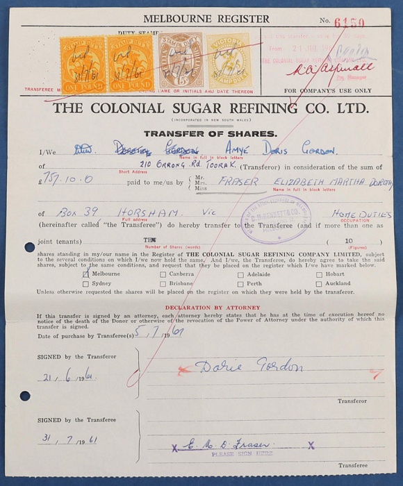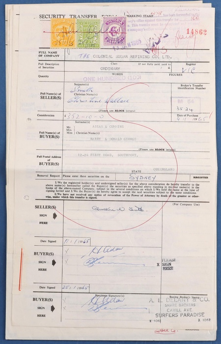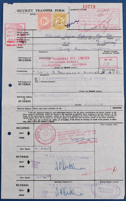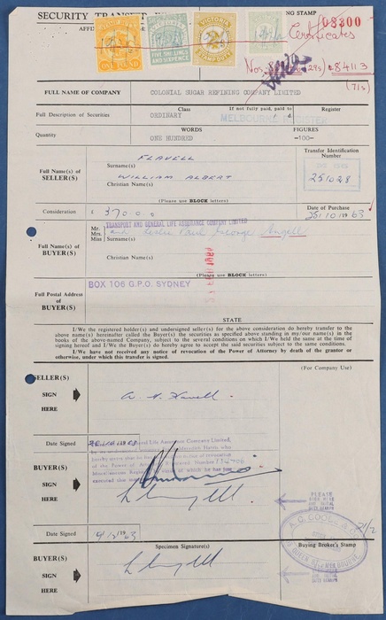 682 imageVictoria - Revenues: 1960s Colonial Sugar Refinery Co share transfer certificates with a range of vals from 9d pink single franking to £2 blue inc multiple frankings of up to 5 stamps. Approx 200 certificates inc a few with decimals attached or with 'Not Chargeable with Stamp Duty' cachets. (Image1) (Image2) (Image3) (Image4) (Image5) (Image6) (Image7) (Image8) (Image9) (Image10) (Image11) (Image12) (Image13) (Image14) (Image15) (Image16) (Image17) (Image18) (Image19)