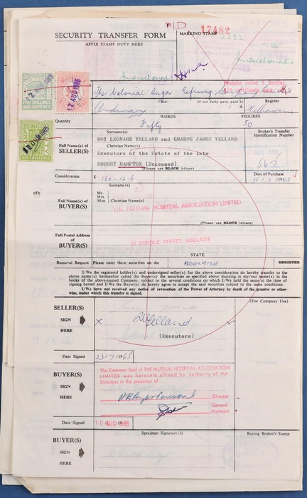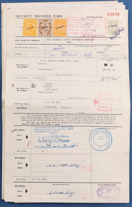 681 imageVictoria - Revenues: 1960s Colonial Sugar Refinery Co share transfer certificates with a range of vals from 1/6 yellow single franking to £2 blue inc multiple frankings of up to 5 stamps. Approx 200 certificates inc a few with 'Not Chargeable with Stamp Duty' cachets or with decimals attached. (Image1) (Image2) (Image3) (Image4) (Image5) (Image6) (Image7) (Image8) (Image9) (Image10) (Image11) (Image12) (Image13) (Image14) (Image15) (Image16) (Image17) (Image18) (Image19)