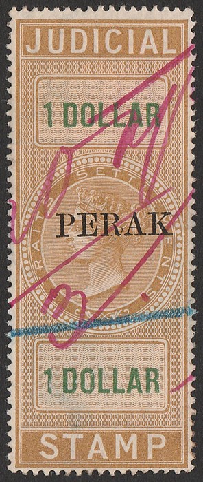 'PERAK' opt QV Judicial $1 brown & green, seriffed, opt 15 x 3mm with curved tail to 'R'. VF F/C, m/s initials. Bft 8. (Image1)