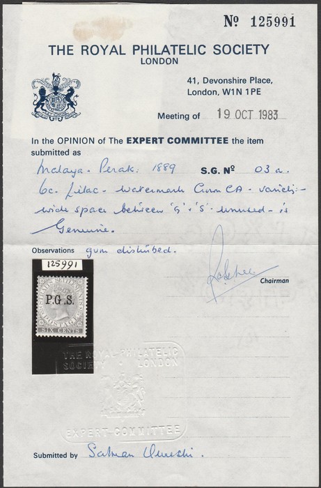 PERAK' black vert opt QV Straits 2c pale rose, opt SG type 27. Superb UN, excellent centring & deep colour. Scott 15A cat US$2150. SG 30a cat £2000. Very rare genuine. Exp Thier & Bloch while certificate can be obtained on request. (P) (Image1)